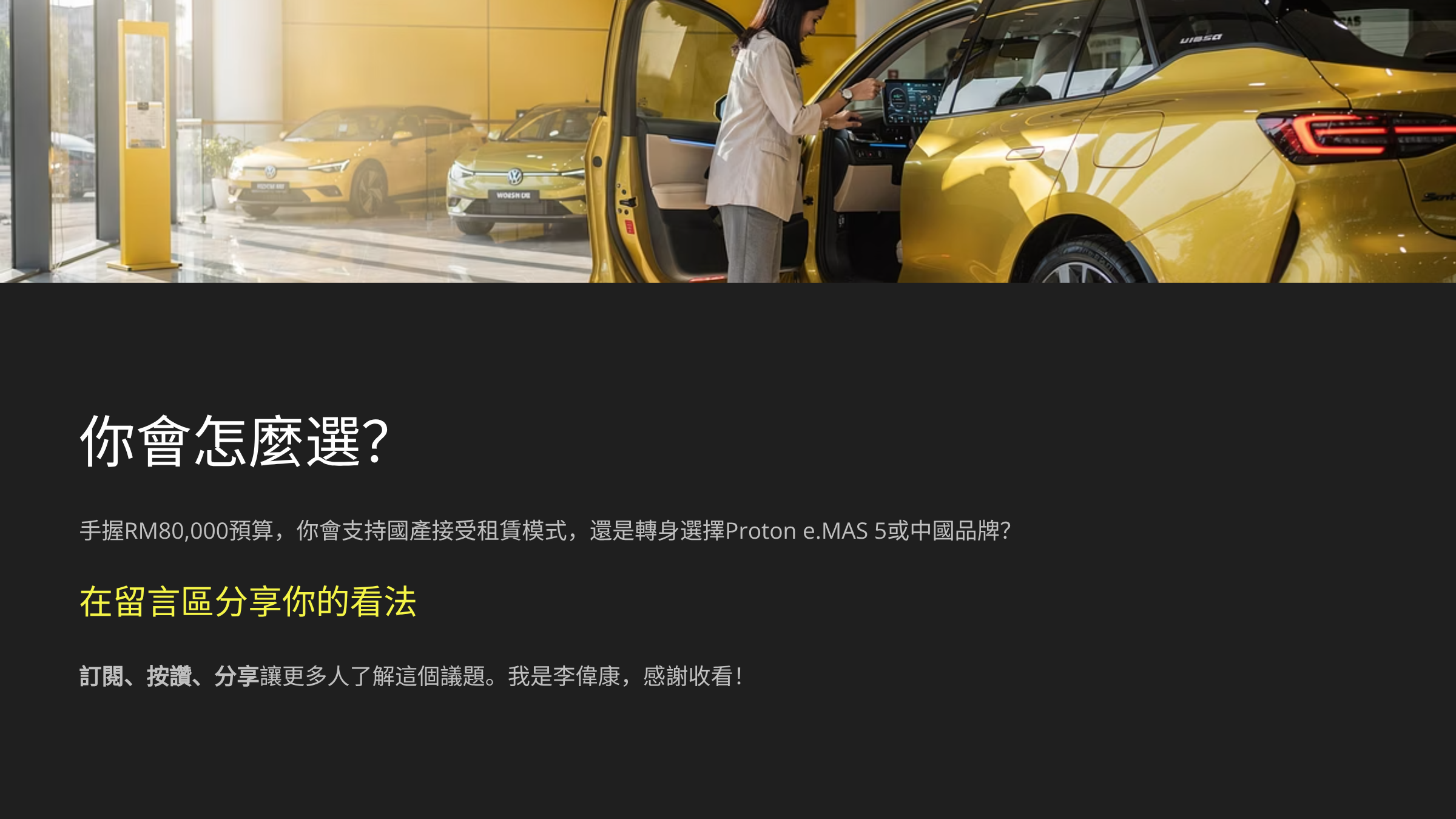 現在,我想把麥克風交給你們。 如果是你,手握 RM80,000 的預算: 你會選擇支持國產,接受這個「電池租賃」模式? 還是轉身去買 Proton e.MAS 5,或者其他的中國品牌電動車?歡迎再留言區一起討論