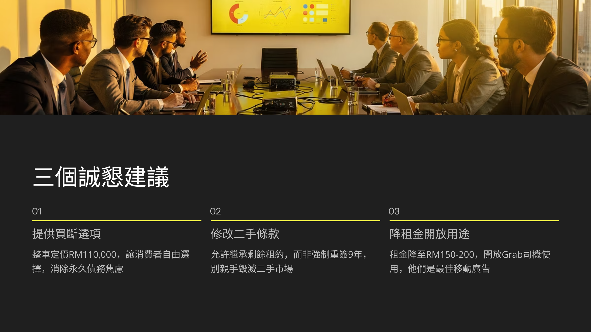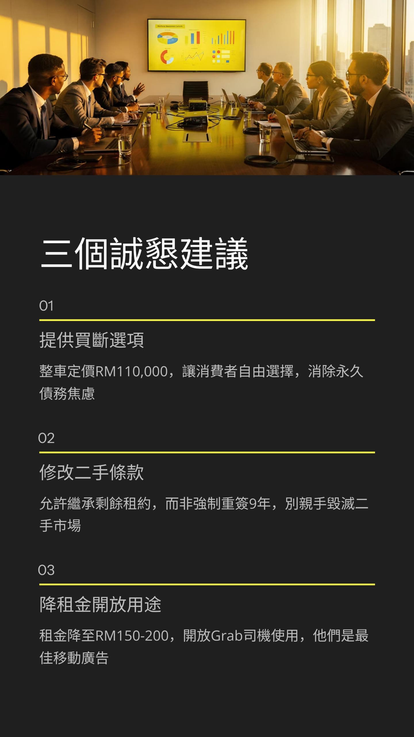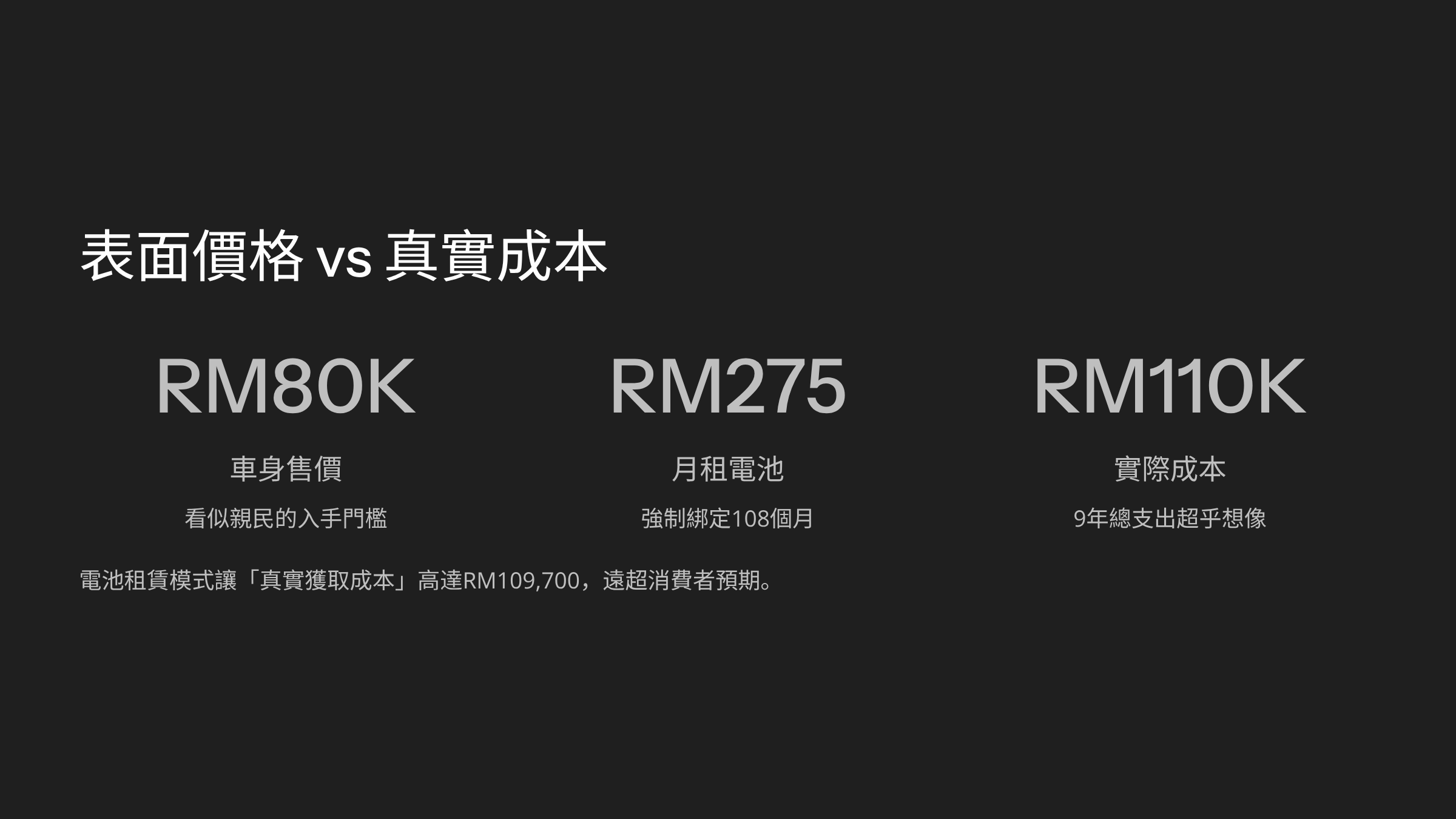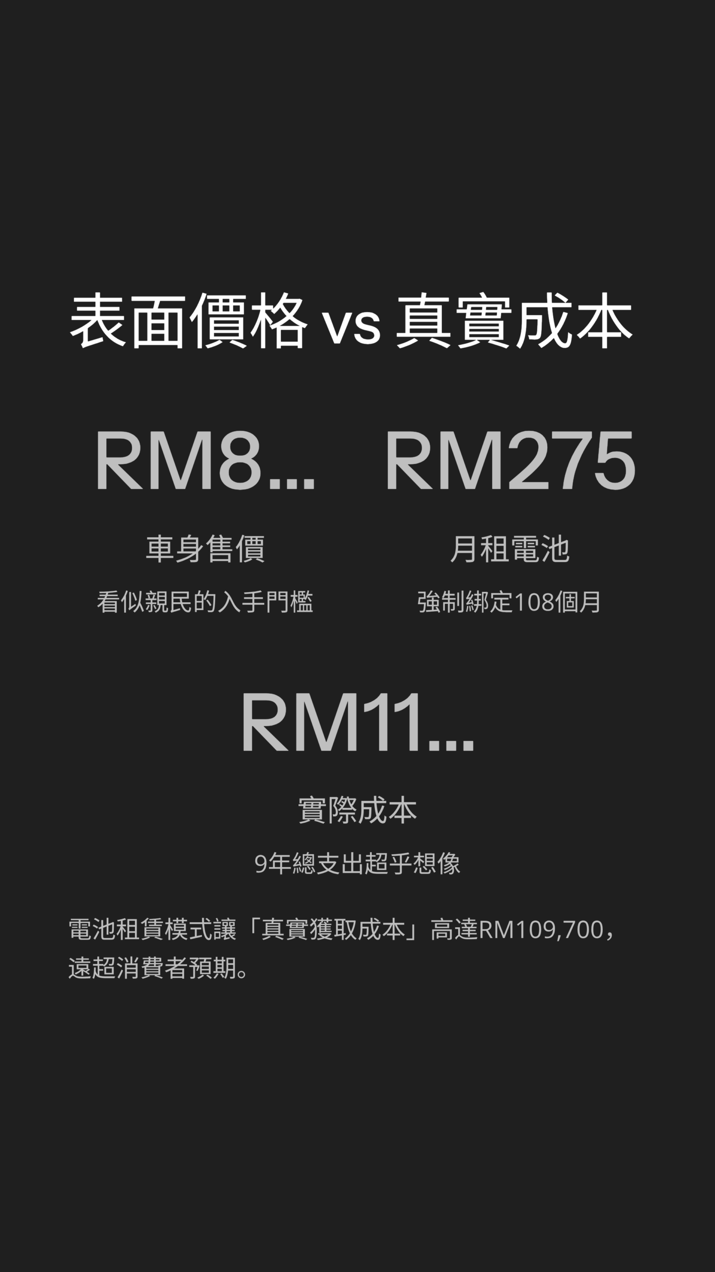 第一,必須提供「買斷選項」。 給消費者選擇權。如果你覺得電池值 RM30,000,那就把整車定價在 RM110,000,讓人們自己選。讓願意貸款買斷的人去買斷,消除那種「永遠還不完債」的焦慮。