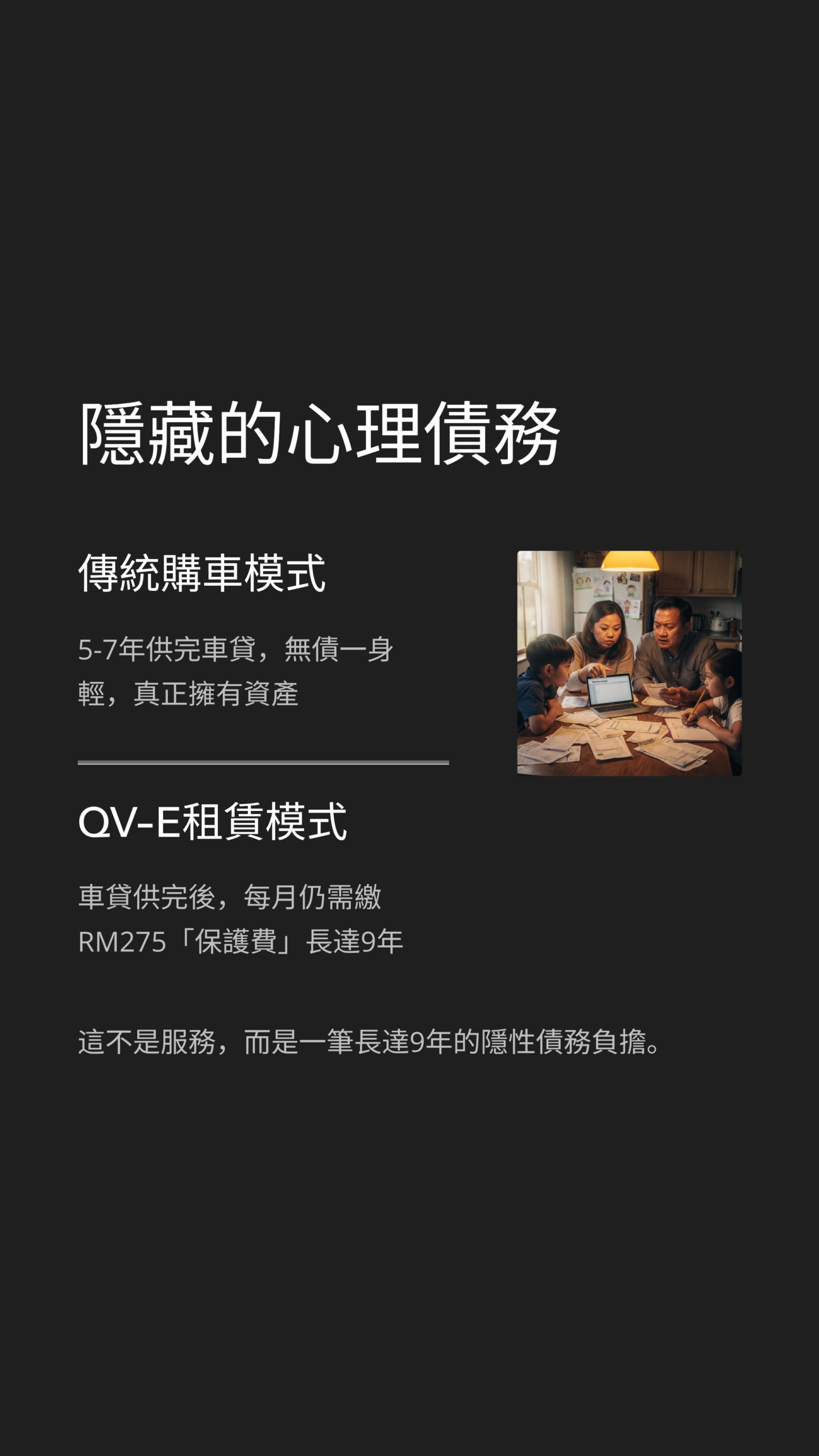 我們買車,買的是自由,是說走就走的權利。但 QV-E 的這個模式,讓你感覺自己不是車子的主人,而是一個隨時可能被房東趕出門的「租客」 。這在深層心理上,違背了馬來西亞人「擁車」的傳統觀念 。