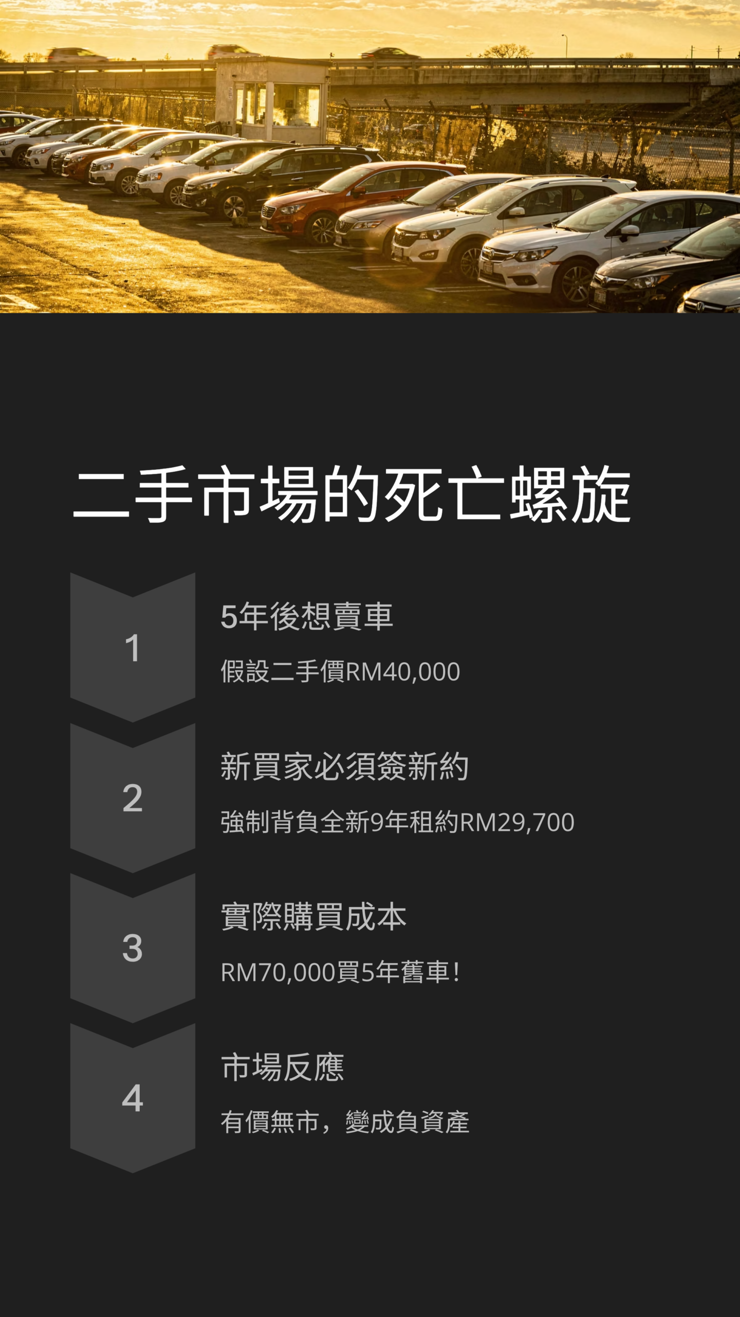 我在寫這篇稿的時候看到一個條款裡面提到,如果你在 9 年內要把車賣掉,你的電池合約不能終止,必須轉給新車主。最離譜的是,新車主必須簽署一份「全新」的 9 年租賃合約 。各位,請想像一下這個場景: 5 年後,你想把你的 QV-E 賣掉。 買家來了,他看了車,覺得還行。但他不只要付給你車價- 假設 RM40,000,他還要被迫背負一個全新的 9 年租約,總值又要RM29,700 。這就意味著,買一輛 5 年車齡的舊車,實際成本要 RM70,000!而那時候,市面上全新的電動車可能才賣 RM50,000。 誰會買你的車?沒人會買。