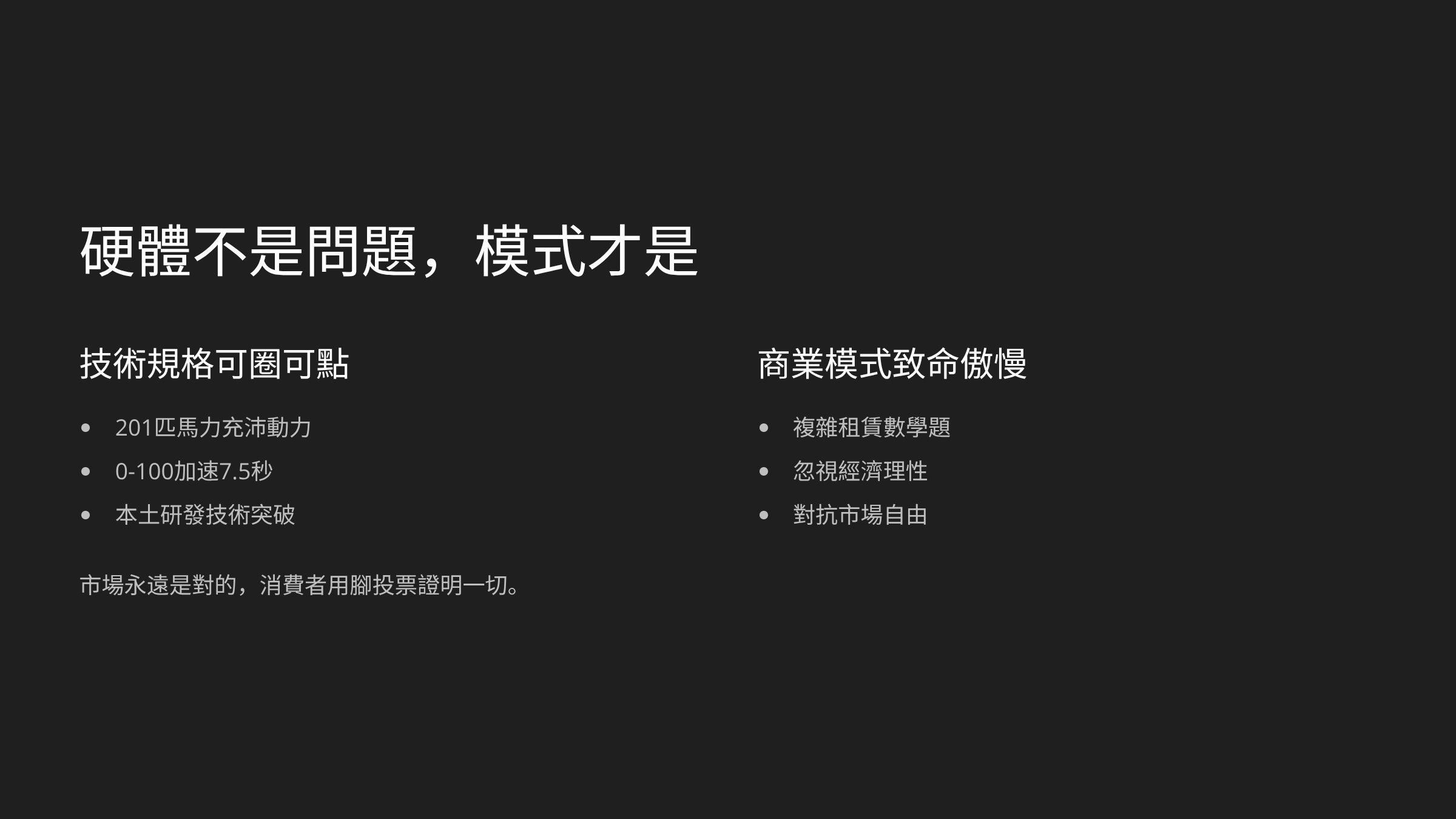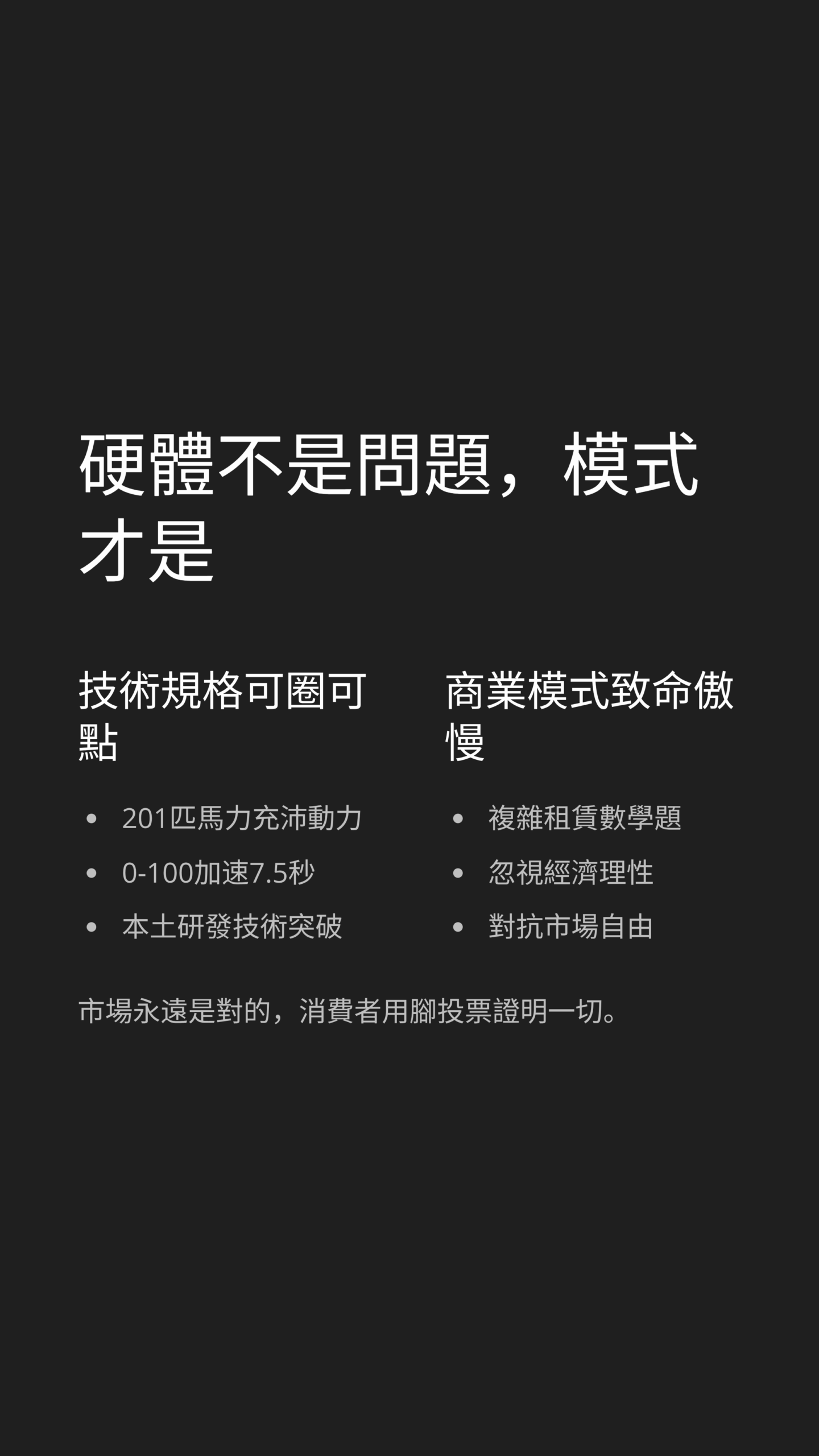 分析了這麼多,我們可以清楚看到,市場對QV-E 的網暴,不是因為技術不行。 老實說,201 匹馬力、0-100加速 7.5 秒,這些硬體數據是拿得出手的 。它的失敗,是商業模式的傲慢。 它試圖用一個複雜的租賃數學題,來忽視消費者最樸素的經濟理性;它試圖用政策的推動力,來對抗市場的自由競爭。但市場永遠是對的。消費者用腳投票的結果證明,大家還是更喜歡簡單、直接、擁有完整所有權的交易模式 。